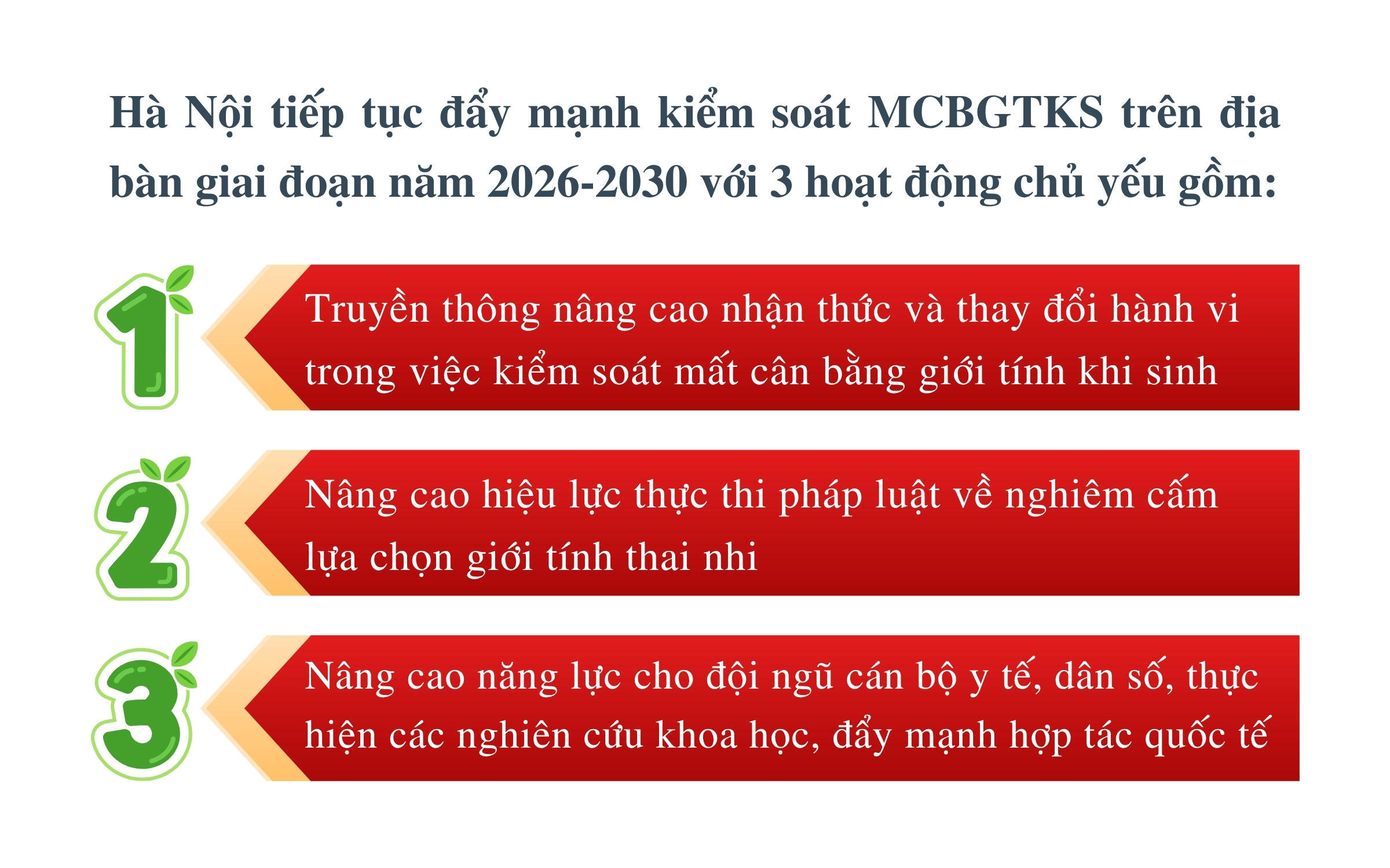 Thời gian tới, Hà Nội tiếp tục đẩy mạnh kiểm soát MCBGTKS trên địa bàn thành phố giai đoạn năm 2026-2030. Mục tiêu nhằm khống chế tốc độ gia tăng tỷ số giới tính khi sinh, phấn đấu giảm dần hàng năm, từng bước đưa tỷ số giới tính khi sinh trở về mức tự nhiên, tạo nền tảng vững chắc cho mục tiêu ổn định cơ cấu dân số, thúc đẩy bình đẳng giới, bảo đảm an sinh xã hội và phát triển bền vững nguồn nhân lực Thủ đô. Cụ thể là khống chế tốc độ gia tăng tỷ số giới tính khi sinh, giảm bình quân 0,2 điểm phần trăm hàng năm, phấn đấu đến năm 2030, tỷ số giới tính khi sinh của thành phố không vượt quá 109 trẻ trai/100 trẻ gái.