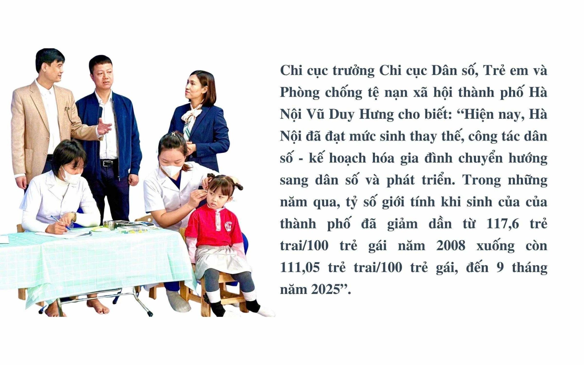 Để thực hiện thúc đẩy bình đẳng giới, giảm thiểu MCBGTKS, Chi cục trưởng Chi cục Dân số, Trẻ em và Phòng chống tệ nạn xã hội thành phố Hà Nội Vũ Duy Hưng cho biết, Hà Nội luôn quan tâm và coi trọng công tác dân số. Hiện nay, Hà Nội đã đạt mức sinh thay thế, công tác dân số - kế hoạch hóa gia đình chuyển hướng sang dân số và phát triển. Trong những năm qua, tỷ số giới tính khi sinh của của thành phố đã giảm dần từ 117,6 trẻ trai/100 trẻ gái năm 2008 xuống còn 111,05 trẻ trai/100 trẻ gái, đến 9 tháng năm 2025. Tuy nhiên, vẫn còn những khu vực mất cân bằng giới tính ở mức rất cao, gây áp lực lên công tác dân số và phát triển hiện nay. Mặc dù tỷ số giới tính khi sinh của toàn thành phố đang có xu hướng giảm nhưng vẫn trên mức báo động. Nếu không có những can thiệp mạnh mẽ và kịp thời, MCBGTKS sẽ dẫn đến những hệ lụy khó lường về trật tự xã hội, an ninh, chính trị; dẫn đến hiện tượng thiếu nữ thừa nam trong độ tuổi kết hôn và dẫn đến phá vỡ cấu trúc gia đình ảnh hưởng tới chất lượng dân số trong tương lai...